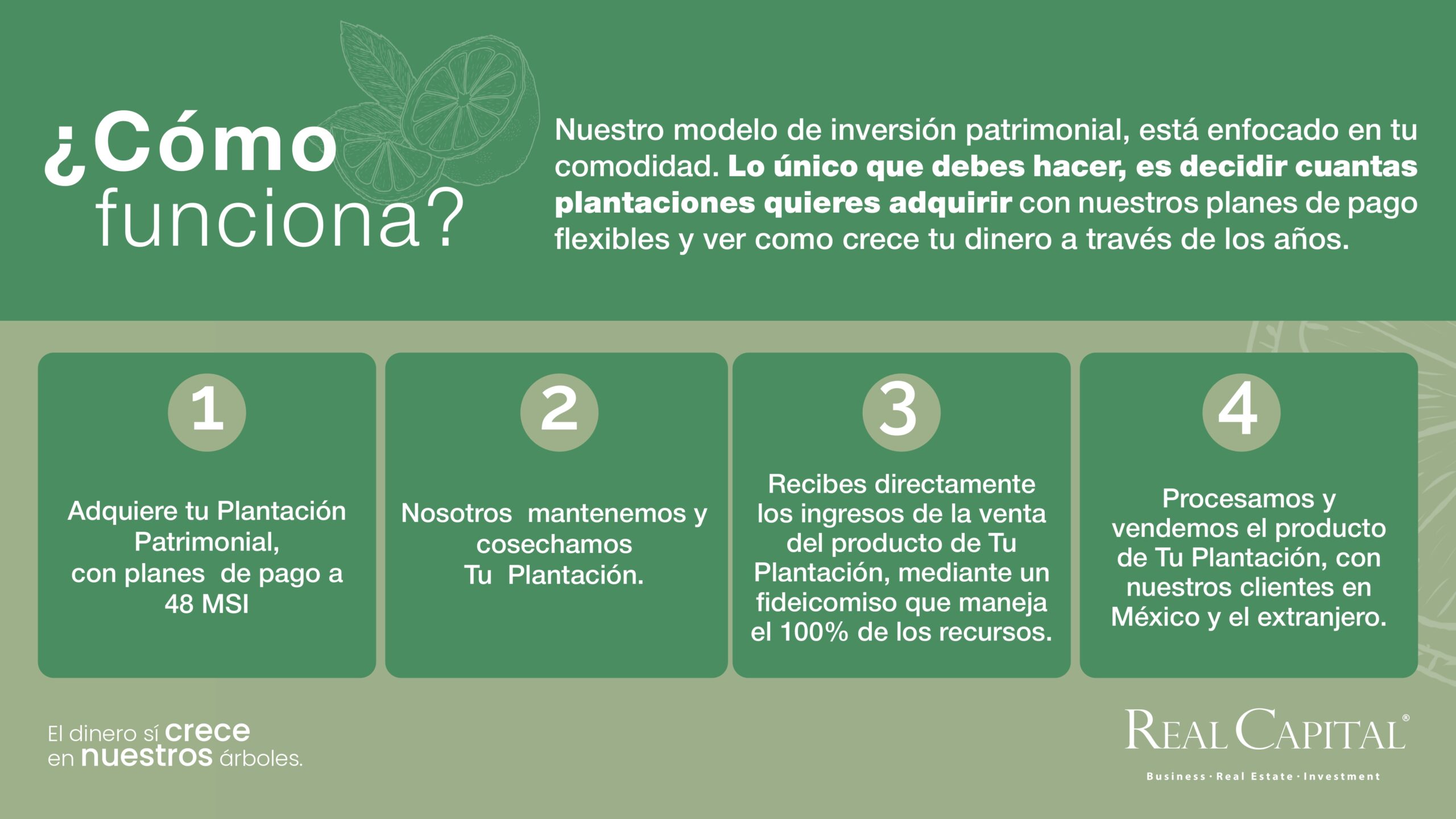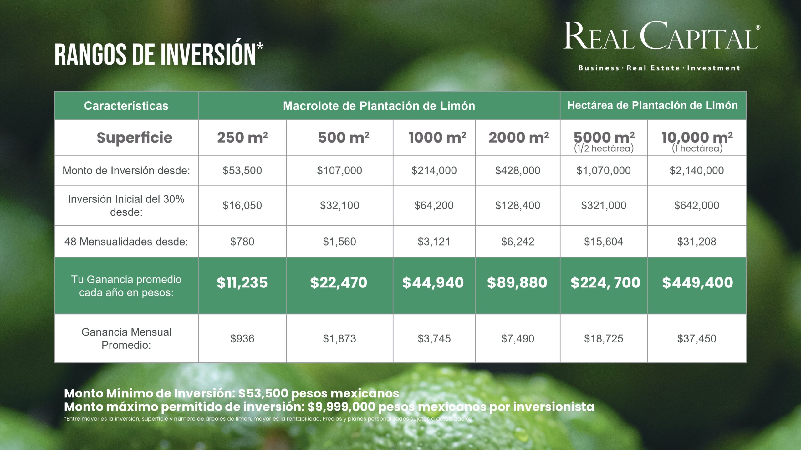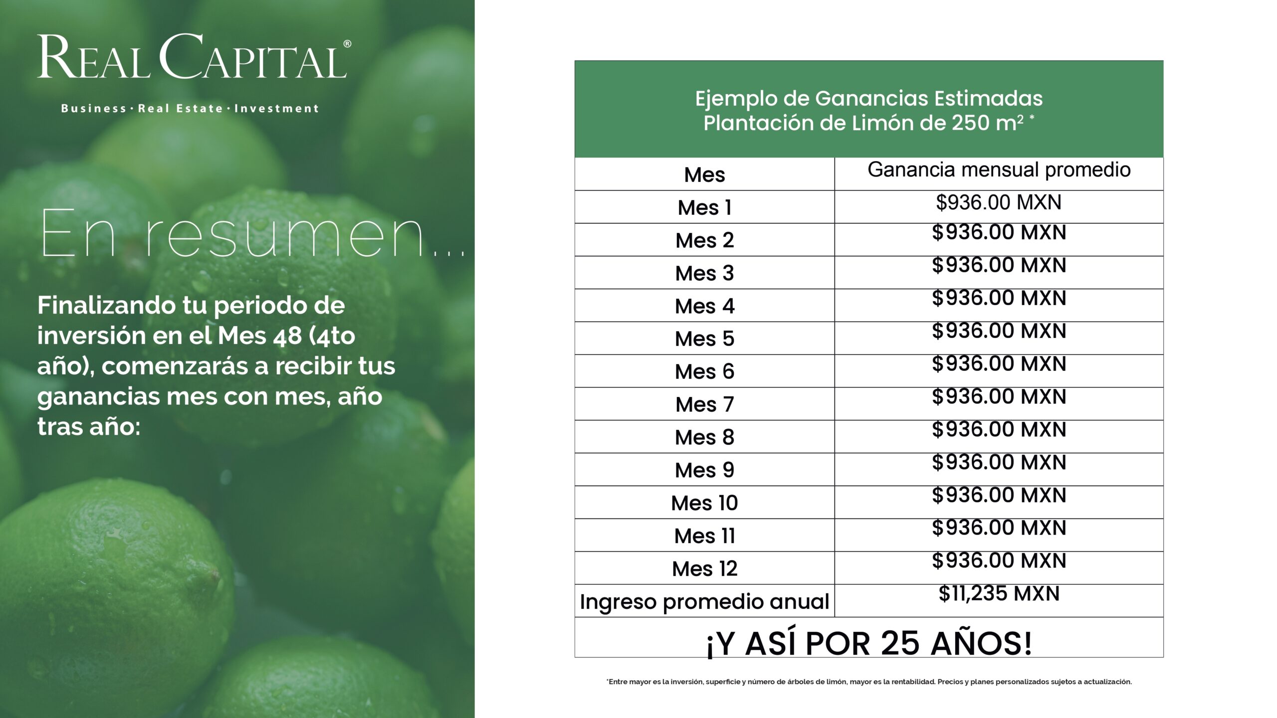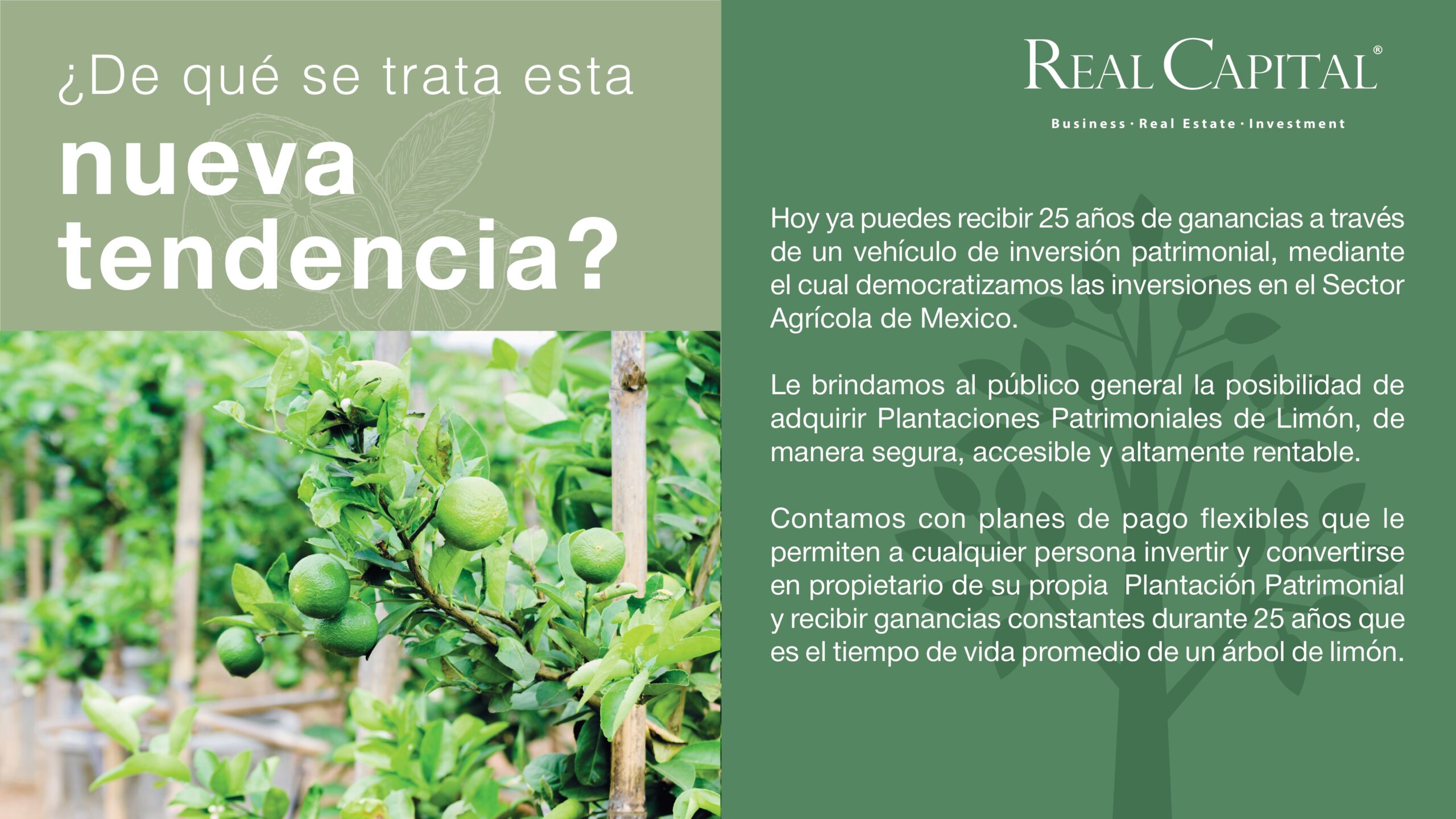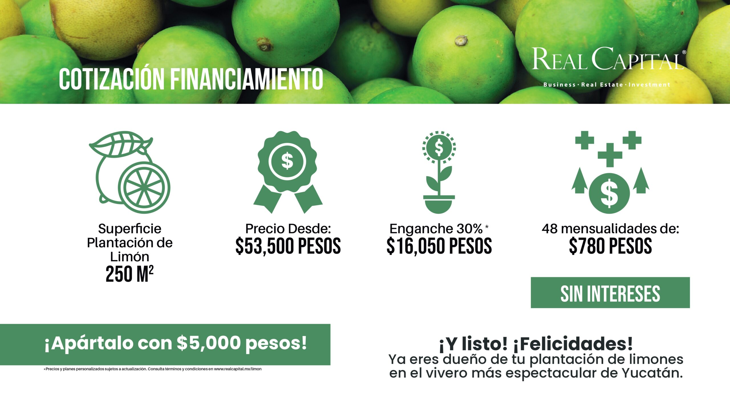 En el corazón de Yucatán, nace un proyecto agrícola único y exclusivo, donde el limón persa sin semilla se convierte en el motor de un crecimiento económico y sustentable. Este proyecto ofrece a los inversionistas la oportunidad de formar parte de un mercado de exportación en constante expansión hacia Estados Unidos y otros destinos internacionales, generando ingresos mensuales durante 25 años. Con una rentabilidad anual promedio del 21%, seguro agrícola y una gestión especializada que cuida cada detalle de la producción, cada plantación representa no solo una inversión sólida, sino también un compromiso real con el desarrollo de la tierra y el bienestar de las comunidades locales.