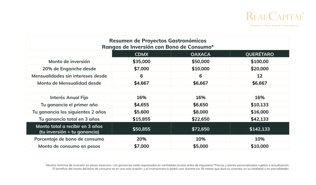 *Montos mínimos de inversión en pesos mexicanos. Las ganancias están expresadas en cantidades brutas antes de impuestos. Precios y planes personalizados sujetos a actualización. El beneficio del bono de consumo es en una sola ocasión y el inversionista lo podrá usar durante los 36 meses que dura su contrato, en su totalidad o en parcialidades.